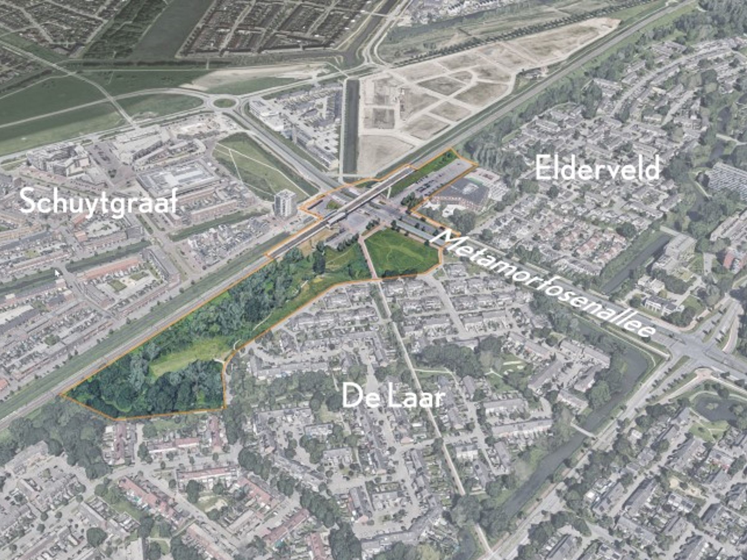 Locatie van het gebied van station Arnhem Zuid tussen de wijken De Laar, Schuytgraaf en Elderveld.